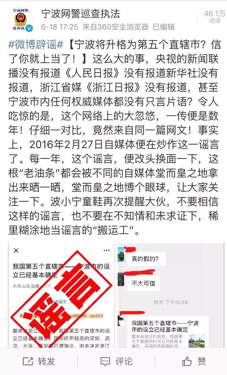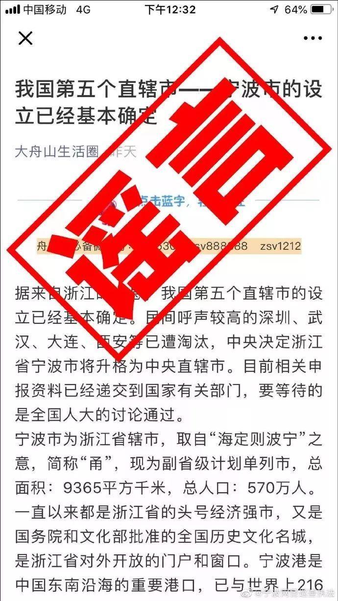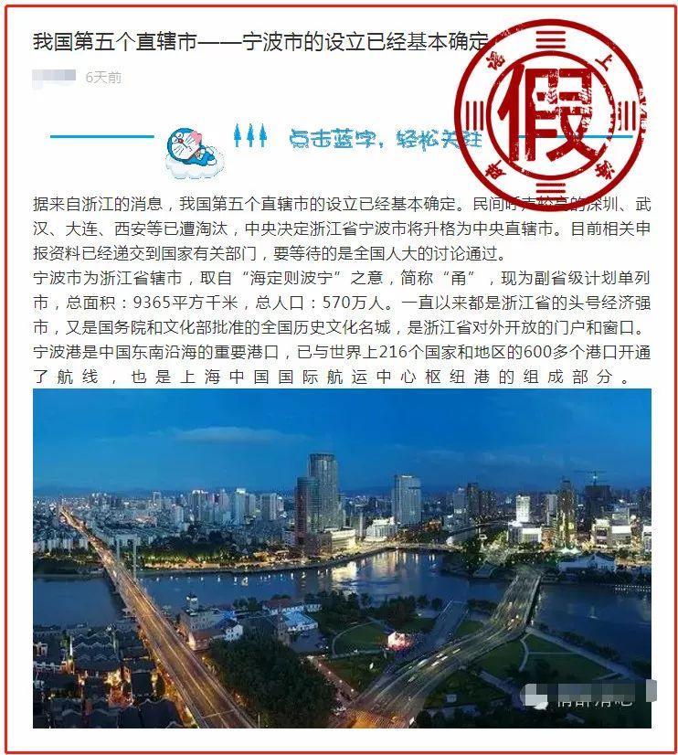网络谣言粉碎机第五个直辖市宁波市的设立已基本确定?假的!
