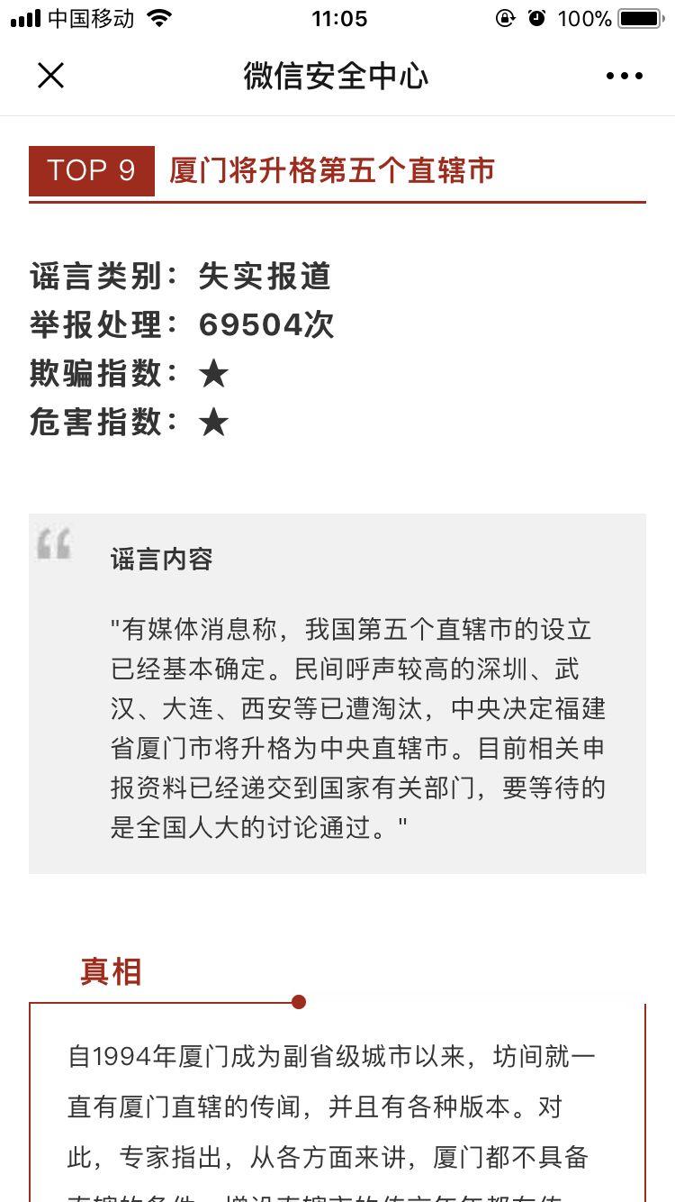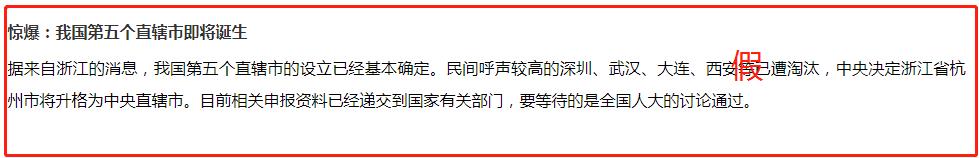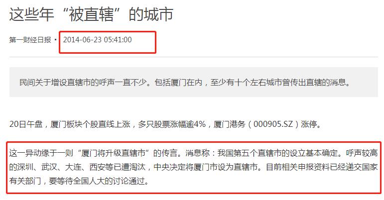 2014年6月,第一财经日报曾刊发《这些年“被直辖”的城市》一文,对当时流传的“我国第五个直辖市——厦门市的设立已经基本确定”的说法进行过辟谣报道,文中提到的谣言内容,也正是来源于这个谣言模板。