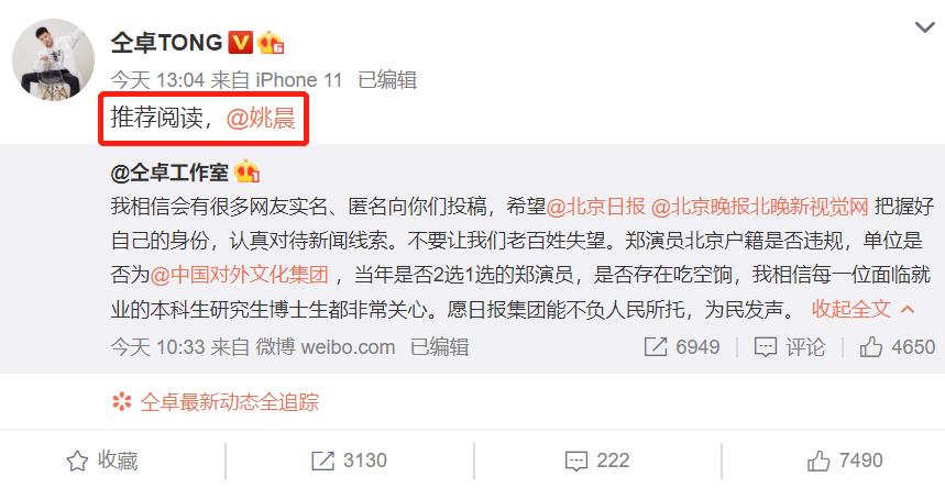 7月11日下午,仝卓又发了一条微博,特意艾特了姚晨,然姚晨看清楚郑云龙是什么人。郑云龙涉嫌违规获得北京户口,已经被网友举报了(或许就是被仝卓举报的)。仝卓现在真的有点“疯魔”了,逮谁骂谁,整个娱乐圈的人都会被他得罪光吧?