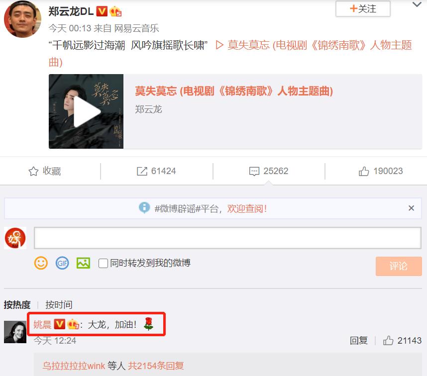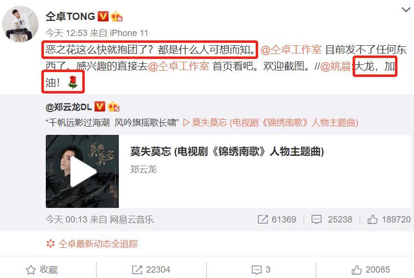 7月11日凌晨,郑云龙终于发了一条微博,上传了自己为电视剧《锦绣南歌》演唱的主题曲的MV,歌名叫《莫失莫忘》,疑似“讨好”仝卓:不要忘了昔日的友谊!众所周知,仝卓和郑云龙都是因为参加湖南卫视《声入人心》出道的,曾经是队友。