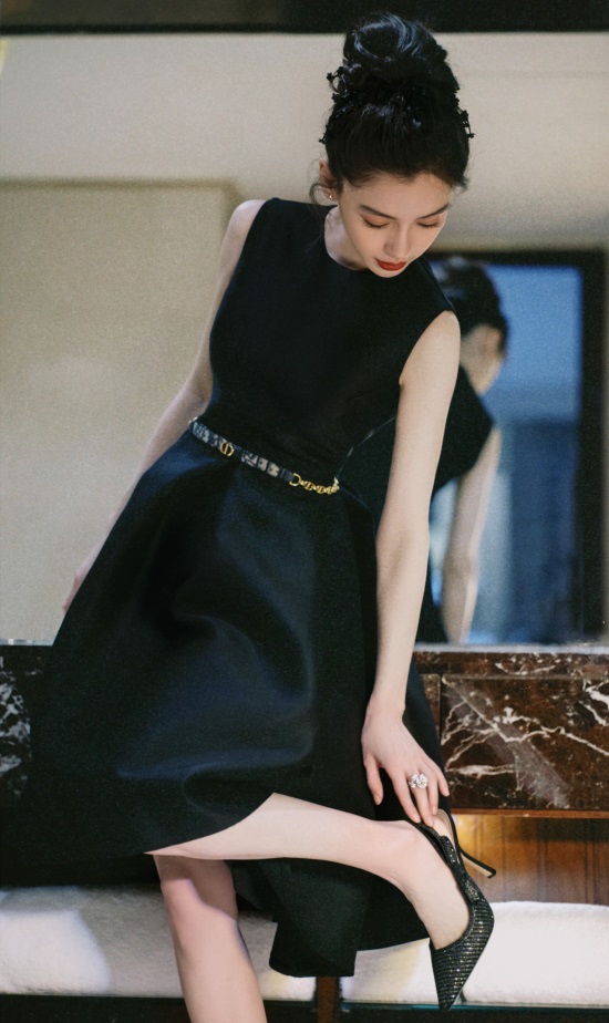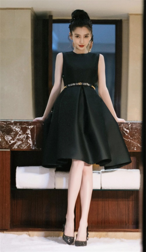 2.angelababy杨颖身穿无袖黑色连衣裙,脚踩后镂空闪闪发亮的尖头高跟鞋,还抬脚了呢,好漂亮。