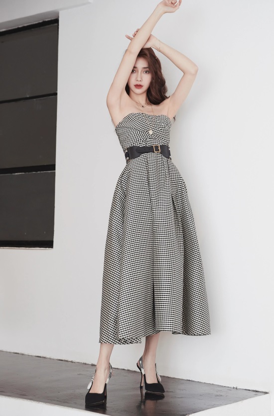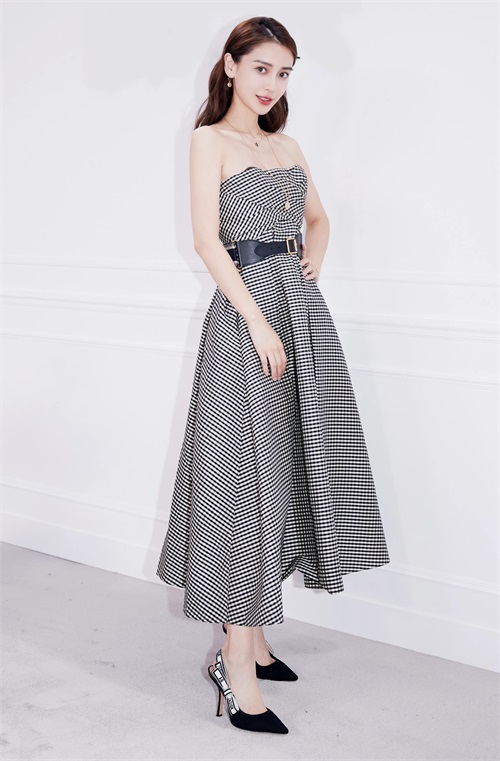 1.angelababy杨颖身穿灰色格子连衣长裙搭配迪奥尖头高跟鞋,