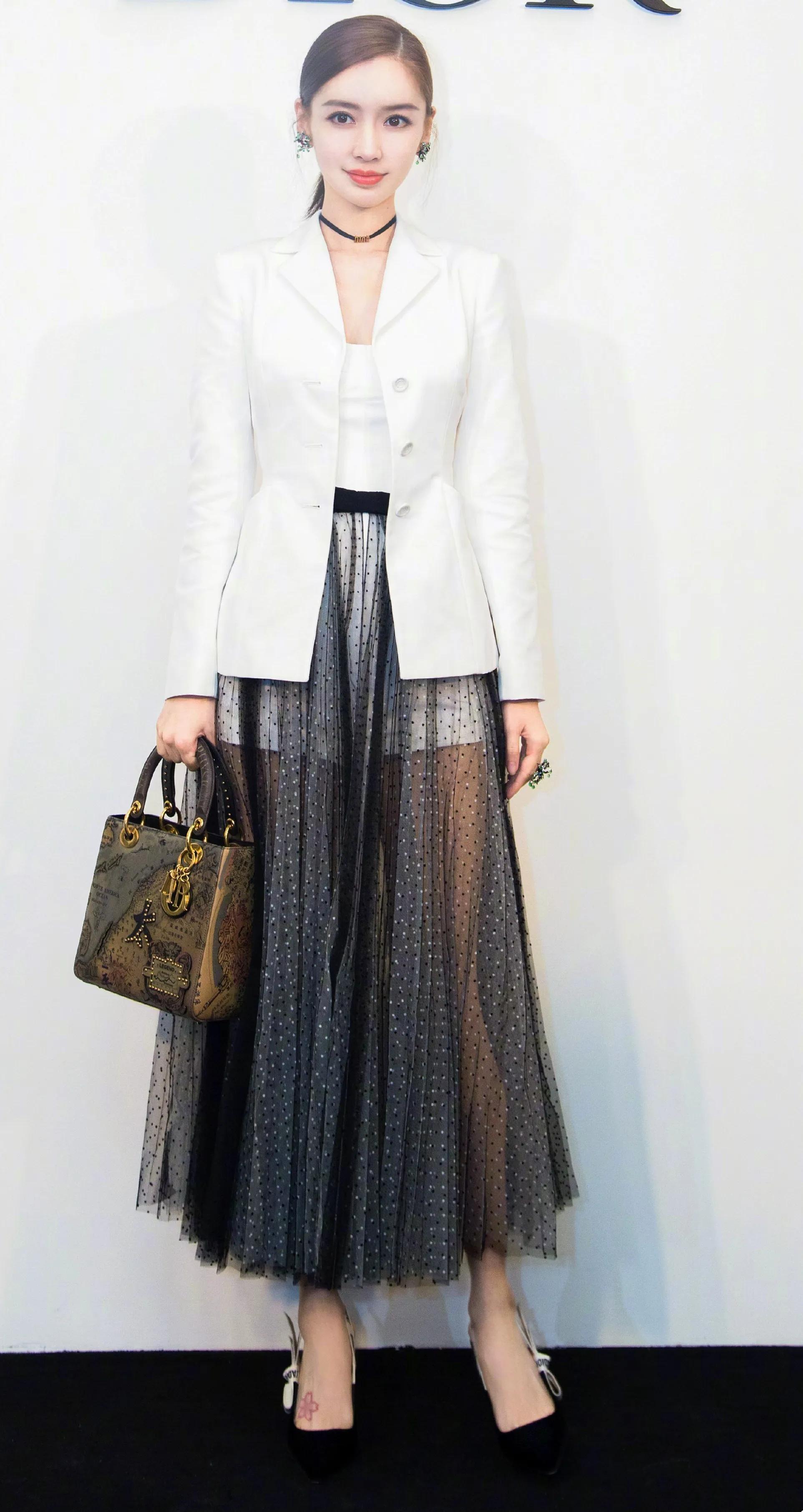 4.angelababy白色西装搭配鎏金黑色透明长裙,脚上穿的依旧是那双迪奥尖头高跟鞋。