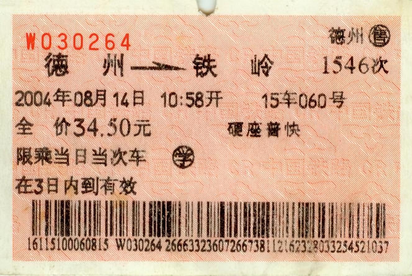 收藏的2004年的计算机车票,那个时候全国车站售票已经全国联网,但是还没有上互联网,也就是12306。那时候火车票上还是条形码,条形码有个小秘密:这张票条形码的最后四位1037代表:德州至铁岭铁路里程是1037公里。那时候车票还没有实名制。
