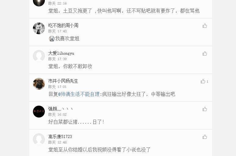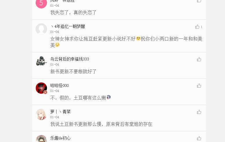 有说虽然我是看着堂姐的视频长大的,但是你也得让我们的土豆去写书啊,只要不断更啥事都好商量。堂姐结婚以后真的是要多惨有多惨,不仅堂姐的视频没得看了,连土豆的小说都没有了,真是难受啊,不过小编还是祝福土豆和堂姐的,毕竟在一起真的不容易。