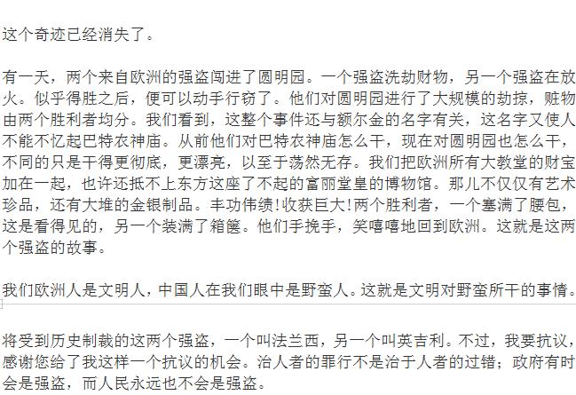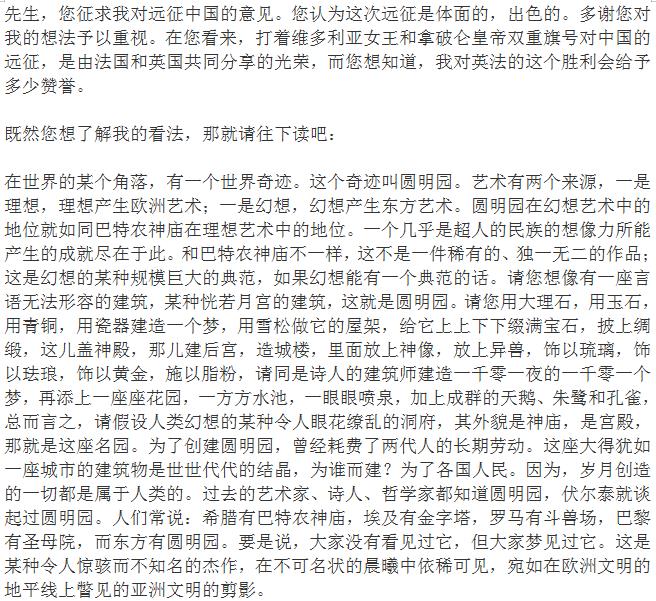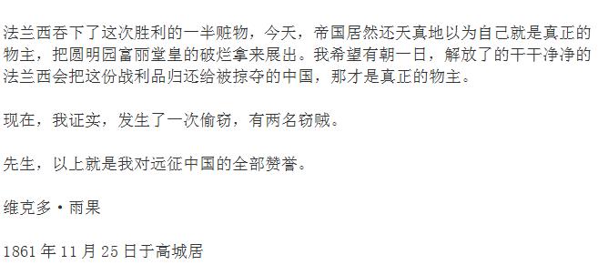 雨果的这份说明同样证明了是英国军队烧毁了圆明园,而法国军队只是洗劫财物,并没有参与放火。