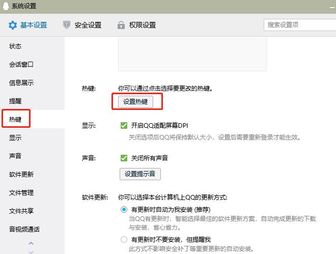 QQ也带有截图功能,缺省快捷键是Alt+Shift+A键,只要同时按下它们,就可以截取全屏或局部截屏。当然,这个快捷键我们可以自定义你喜欢的组合。打开QQ的设置,点击左侧导航的“热键”菜单(如下图)。