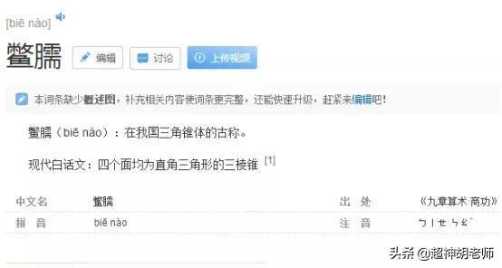 立体几何做题的过程中,经常会看到题目里提到鳖臑几何体,话说这两个字怎么读?我们查一下万能的百度,原来这两个字读音类似于“别闹”,鳖臑是一个四面均为直角三角形的三棱锥。最早是在2015年湖北高考卷中提到,从此鳖臑就身价暴涨,更有甚者将其称之为立几小王子。当然这个鳖臑在古代也有提到,《九章算术·商功》:“斜解立方,得两堑堵。斜解堑堵,其一为阳马,一为鳖臑。阳马居二,鳖臑居一,不易之率也。合两鳖臑三而一,验之以棊,其形露矣.”