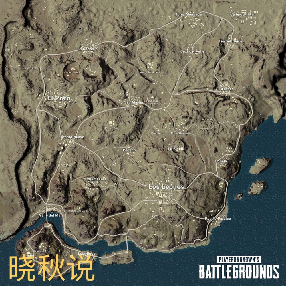 首先是游戏地图:新的绝地求生地图以沙漠为主,同时也还有海。从新的地图上看,最肥的地方是“Los Leones”,估计以后也会被叫做主城。然后其他能肥的地方有“Chumacera”,这里是废弃的工厂;这个新地图“La Cobreria”和”San Martin“还有”Pecado“算是比较中心的位置。除了这几个地点,其他也有比较肥的地方,具体就不一一多说了。