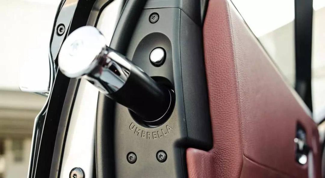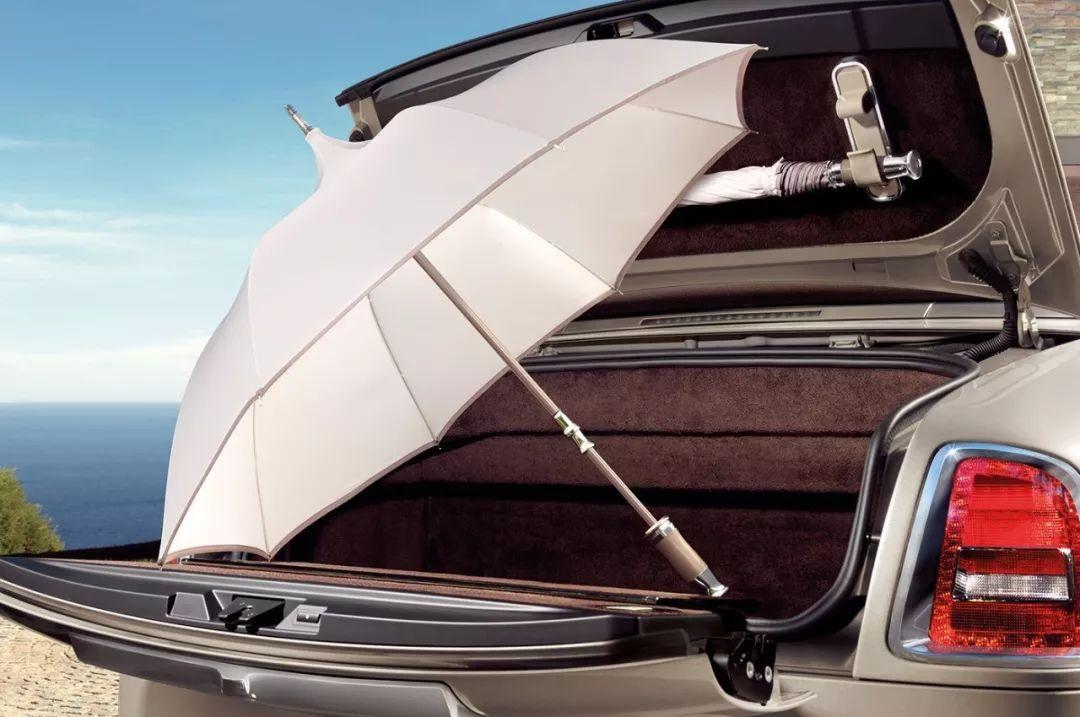 一把雨伞的实际作用并非只用来遮风挡雨,在早期英国马车实际就有一些贵族礼仪需要用伞,而劳斯莱斯常常会出现在各种高档场所以及宴会,当然了这种场合下总不会缺少各路名媛,身着礼服的她们终归要注意一些自身行为避免春光乍现,而这把车载雨伞的价值就很大的体现出来了。同时劳斯莱斯在雨伞的放置问题上也做了很大的功夫,在车内就有空间可以施展撑伞,可以很快的插入雨伞,并且内设烘干设备以及导水槽,能让雨天使用后的雨伞便于插入并且快速烤干。