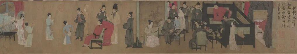 现藏故宫博物院的《韩熙载夜宴图》,画卷纵28.7厘米,横335.5厘米,工笔,绢本,重色,相传作者为五代顾闳中,当代学者多认为此画制于宋代。据古代文献记载,韩熙载相江南,至后主李煜时期,忽然一反常态,耽溺声色,专为夜饮。李煜欲见韩熙载夜饮之态度,特遣国手顾闳中于韩府窥探偷写。