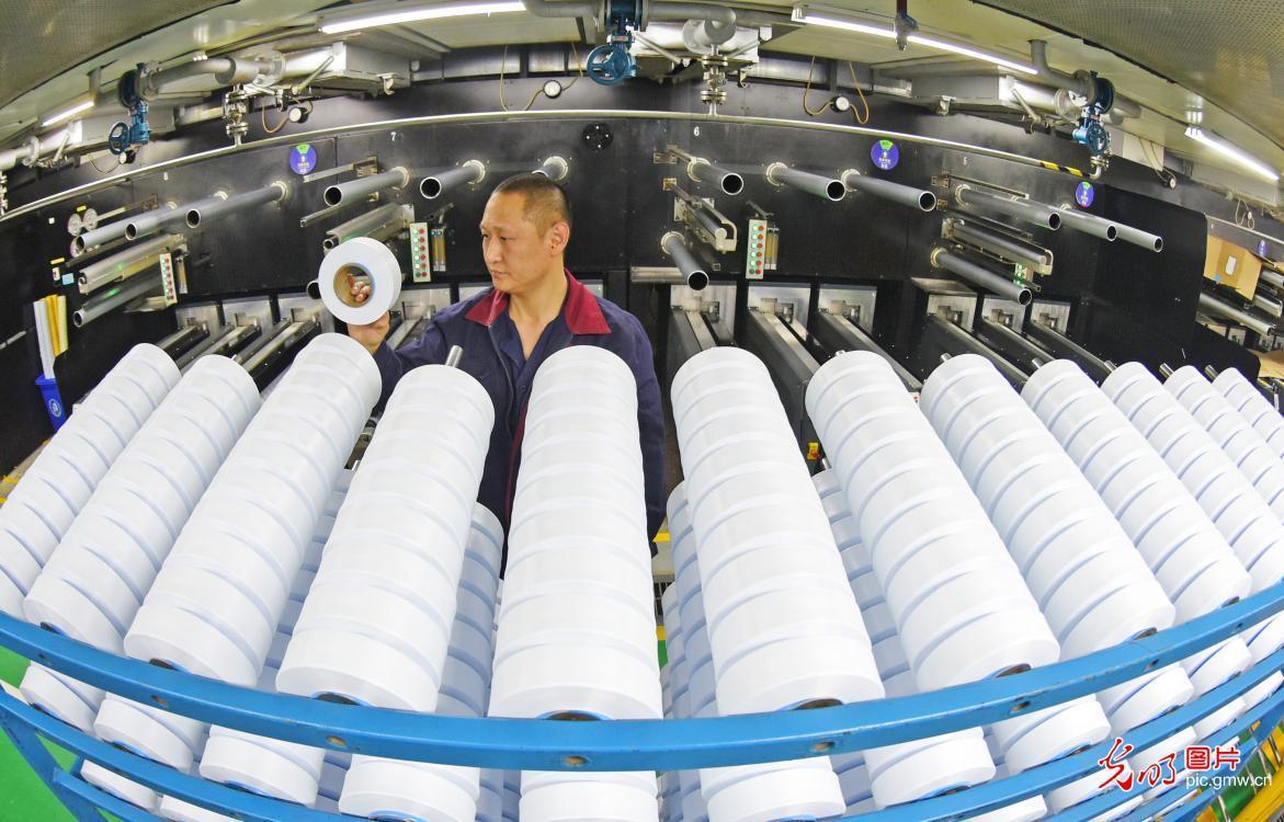 2019年1月21日,国家统计局发布数据显示,2018年我国国内生产总值(GDP)900309亿元,首次突破90万亿元大关。按可比价格计算,GDP比上年增长6.6%,实现了6.5%左右的预期发展目标。图为工人在生产线上查看氨纶丝生产情况。(耿玉和摄/光明图片)