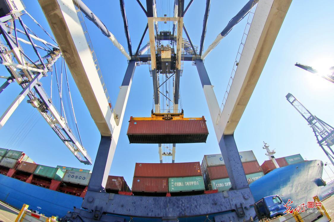 2019年1月21日,国家统计局发布数据显示,2018年我国国内生产总值(GDP)900309亿元,首次突破90万亿元大关。按可比价格计算,GDP比上年增长6.6%,实现了6.5%左右的预期发展目标。图为桥吊进行搬卸作业。(唐克摄/光明图片)