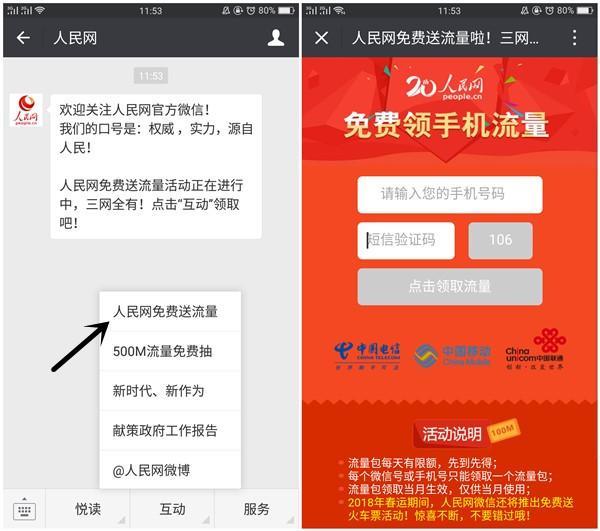 2.点击菜单栏【互动】-【人民网免费送流量】进入活动,验证手机号码然后领取即可(每天9点开抢概率大)。