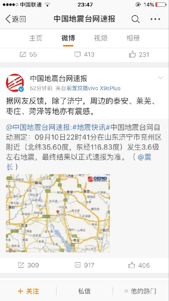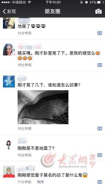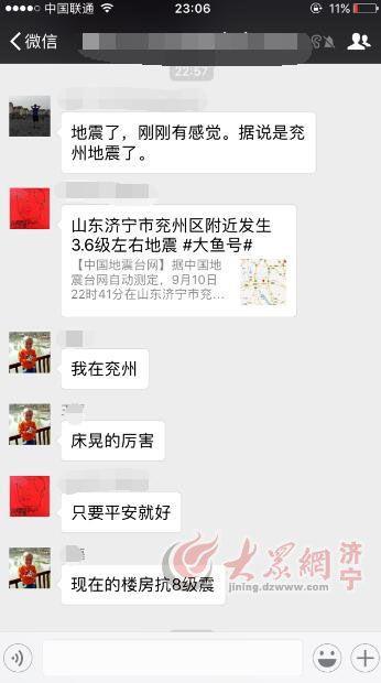 大众网济宁9月10日讯 (记者 李丹)10日晚10点40分左右,济宁网友的朋友圈被“济宁发生地震了”的信息刷屏。兖州、邹城等几个县市区的市民表示震感明显。