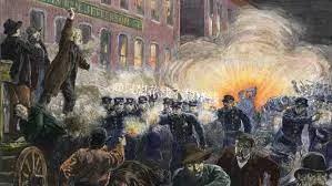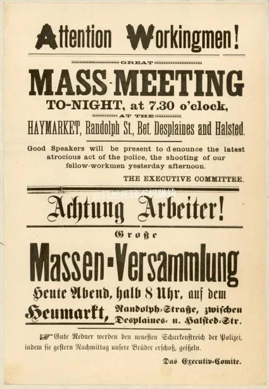 1886年5月1日全美开始举行工人大罢工,向资本家提出八小时工作制。5月3日在麦考密克收割机工厂外举行了一场集会,警察因为工人大罢工与工人对峙,开枪打死了2名工人。这件事造成了美国芝加哥的轰动,2500个劳动工会在5月4日在干草市广场举行大会,情绪激昂,但是过程非常和平。当这场聚会要结束的时候,突然来了180名武装经常,把劳工们包围起来,命令他们即刻解散。当两方对峙的时候,突然有人向警察投掷了一枚炸弹,场面大乱,警察开始向人群开火。一共有7名警察和4名民众当场死亡。数百名劳工领袖被抓,在一场被认为不公平的审判当中有4名劳工领袖被判绞刑被绞死.这就是历史上有名的“干草市场事件”。