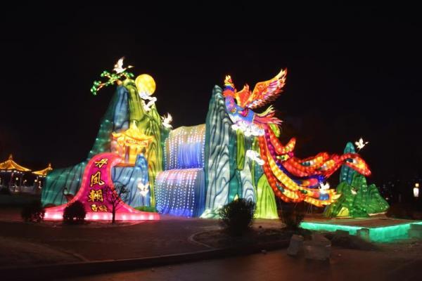 溢彩华章区域的铜鹤广场,由冰雕与彩灯相融合表现形式打造而成,中心区域坐落的是10米高的丹凤朝阳彩灯作品,以长白山为主体造型,融入我们南湖公园的代表建筑四亭桥等元素,同时配以广场上的鹤、松树等,寓意祥瑞、美好。