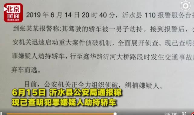 6月15日,沂水县公安局通报称现已查明犯罪嫌疑人劫持轿车,目前公安机关正全力组织侦破,缉捕嫌疑人。