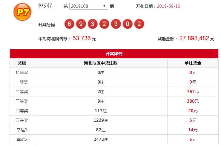 河北福利彩票第2019108期排列7开奖号码:6 9 3 2 3 0 2