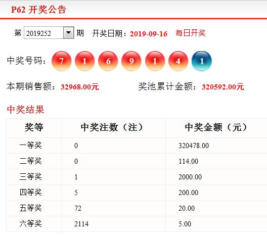 黑龙江福彩第2019252期P62开奖开奖号码: 基本号7 1 6 9 1 4 特别号 1