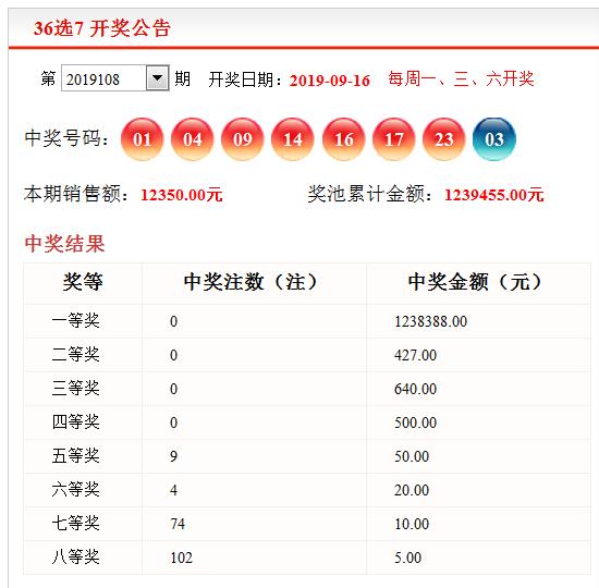 黑龙江福彩第2019108期36选7开奖号码: 01 04 09 14 16 17 23 03