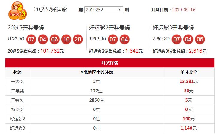 河北福利彩票第2019251期20选5(好运2,3)开奖号码:07 04 06 10 20