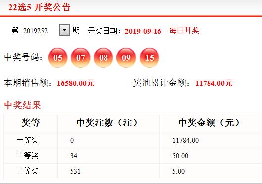 黑龙江福彩第2019252期22选5开奖号码: 05 07 08 09 15