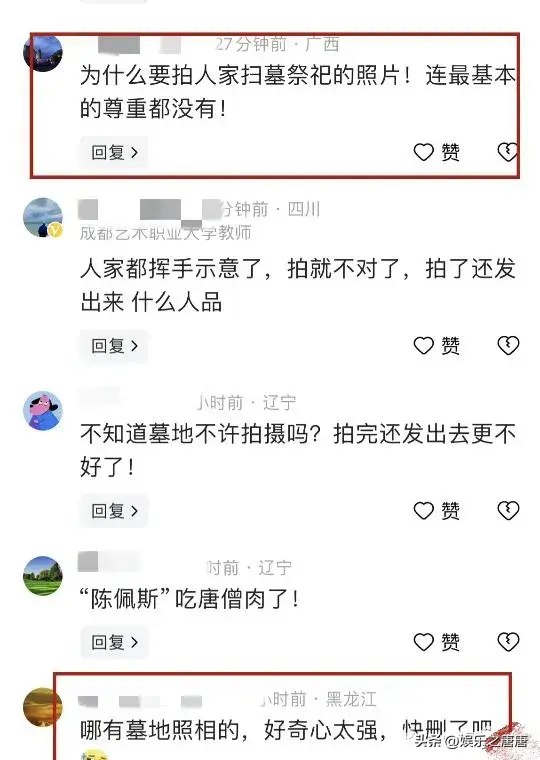 就像4月4日,70岁的陈佩斯带着儿子去八宝山祭拜老父亲,没想到现场就被人偷拍。儿子陈大愚举手示意拍摄者停止,赶紧把手机放下,但却没有成功,不仅如此,照片还被发到了社交媒体上,一时之间引起了粉丝们的热议。