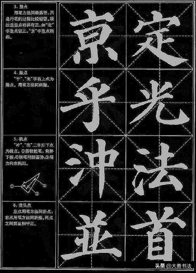 刚开始学习颜体书法,第一步要从其点画上开始,因为颜体楷书的点画是组成汉字的基本单元,只有把这些基本点画学习到位了,对下一步的结体的学习才会打下好的基础。