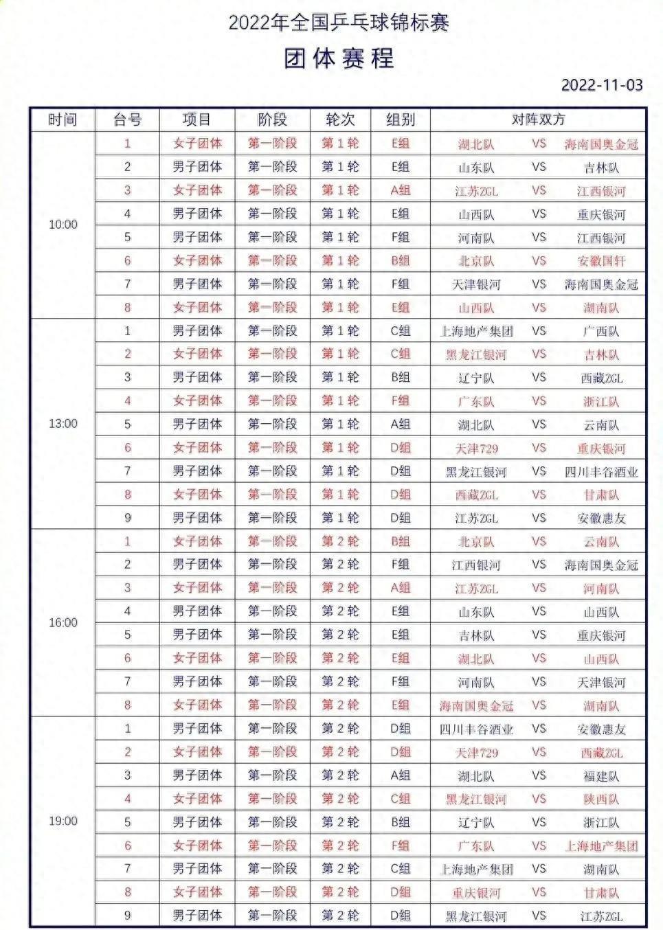 二号桌正在直播女子团体浙江队VS广东队,结束后16:00直播男团山东队VS山西队;