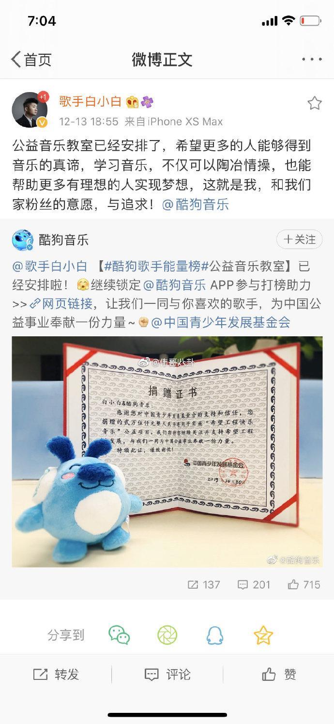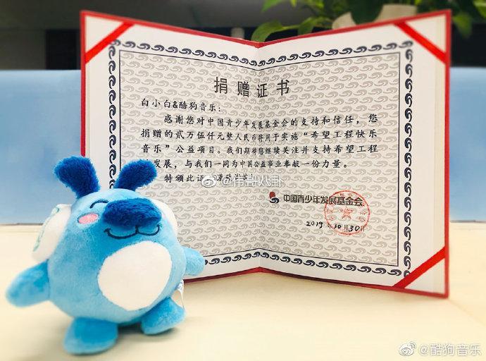 白小白为中国青少年发展基金会捐赠两万五千元人民币,登上酷狗音乐 官方微博得到好评与认可。
