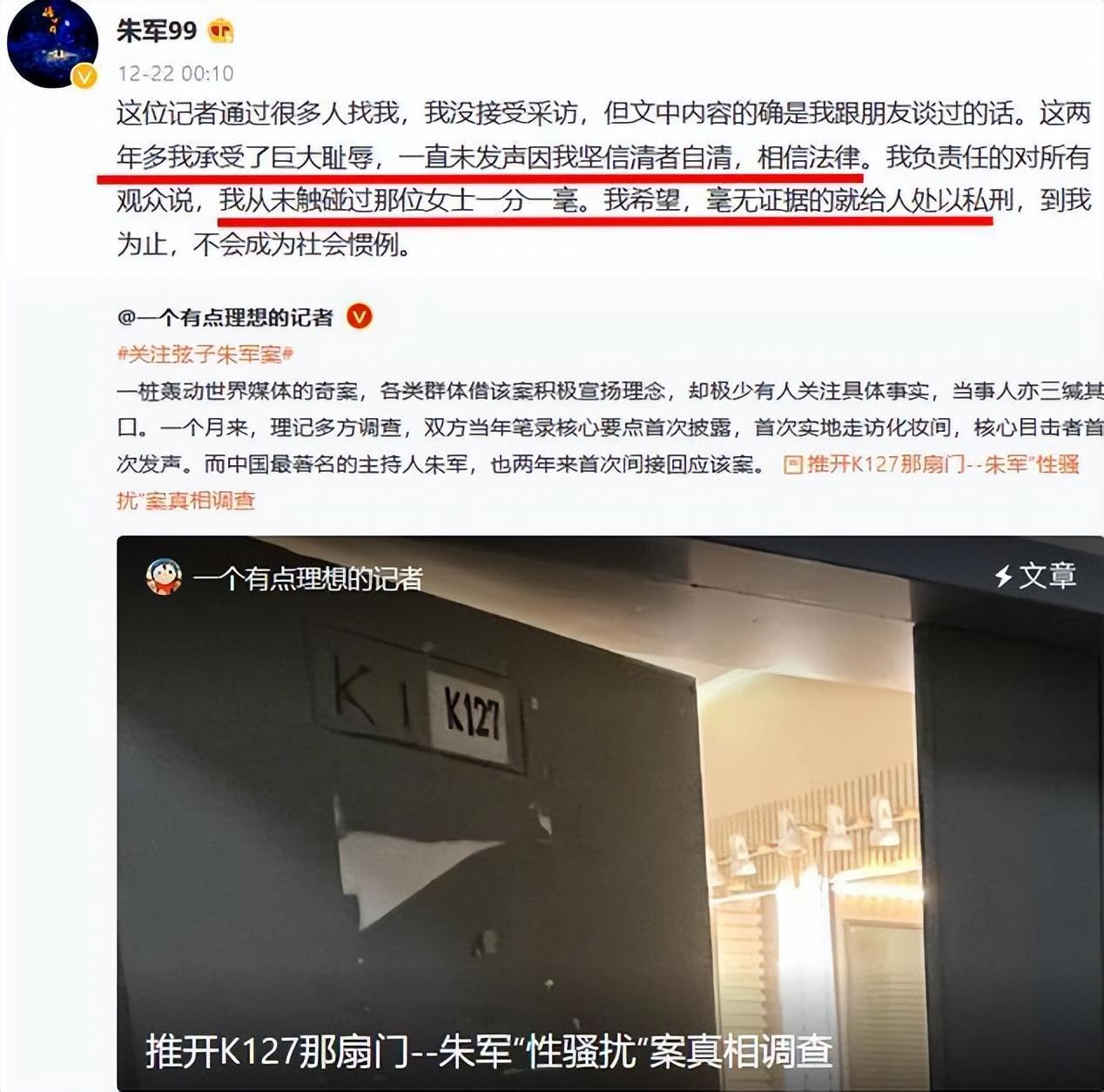 回到朱军案的开始,18年时弦子发了一条微博,说她在央视实习期间,朱军在后台化妆间骚扰了她五十多分钟,文中也说到过,事后自己也报警了,但由于朱军的影响力太大,这件事反而被压下来了。自此,朱军成为了众矢之的,因为他的沉默,导致无数网民倒向弦子,直到一次采访中,朱军回应了这件事。“我才是受害者”