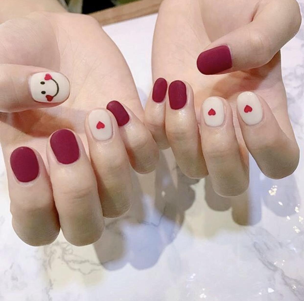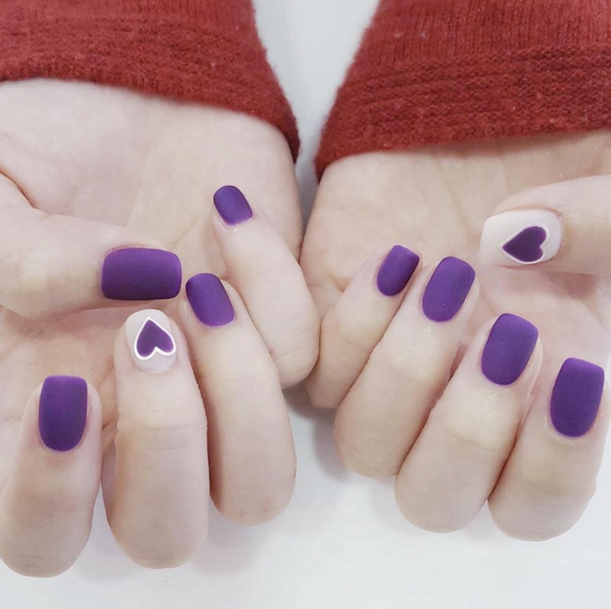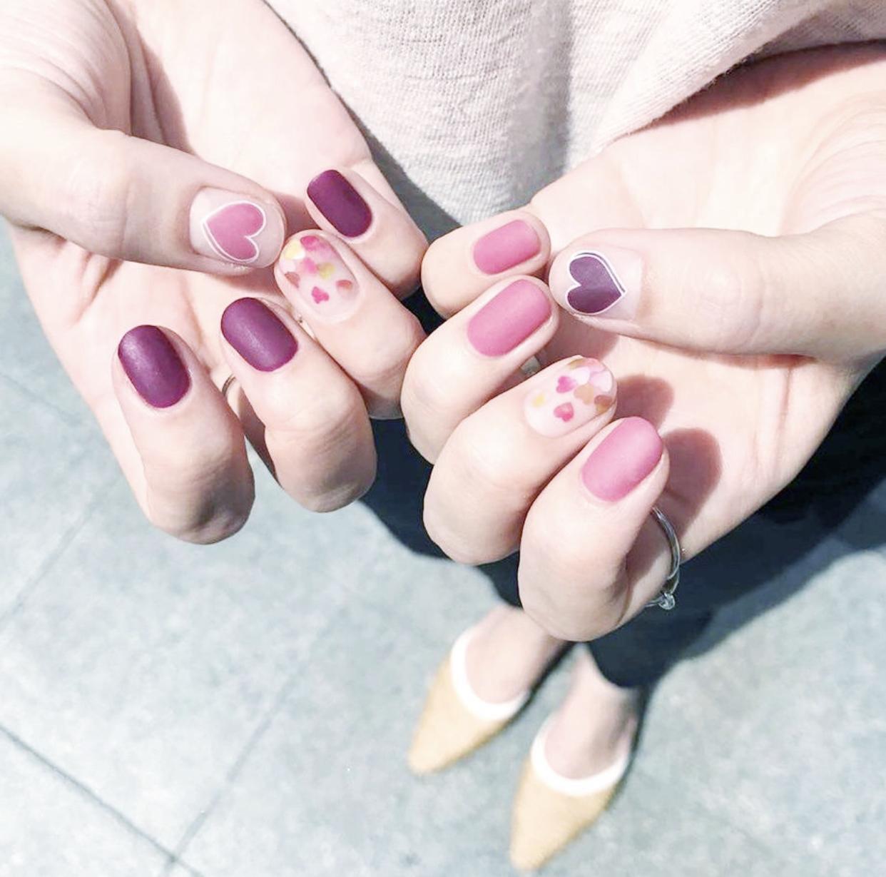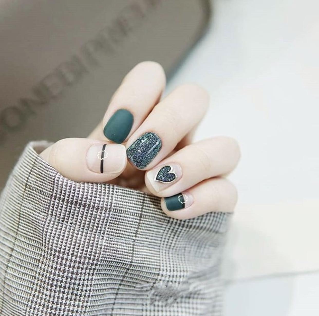 还可以在裸色的甲面上画上心形图案的彩绘,简约又很可爱,搭配心形亮片甲,会让指尖更有活力。很多女生很好奇,亮片美甲刷上磨砂封层是什么样子的~其实在彩色的亮片甲上刷上磨砂封层,也是非常不错的哦~只是迎娶了亮片的部分光泽,反而更有高级感了。