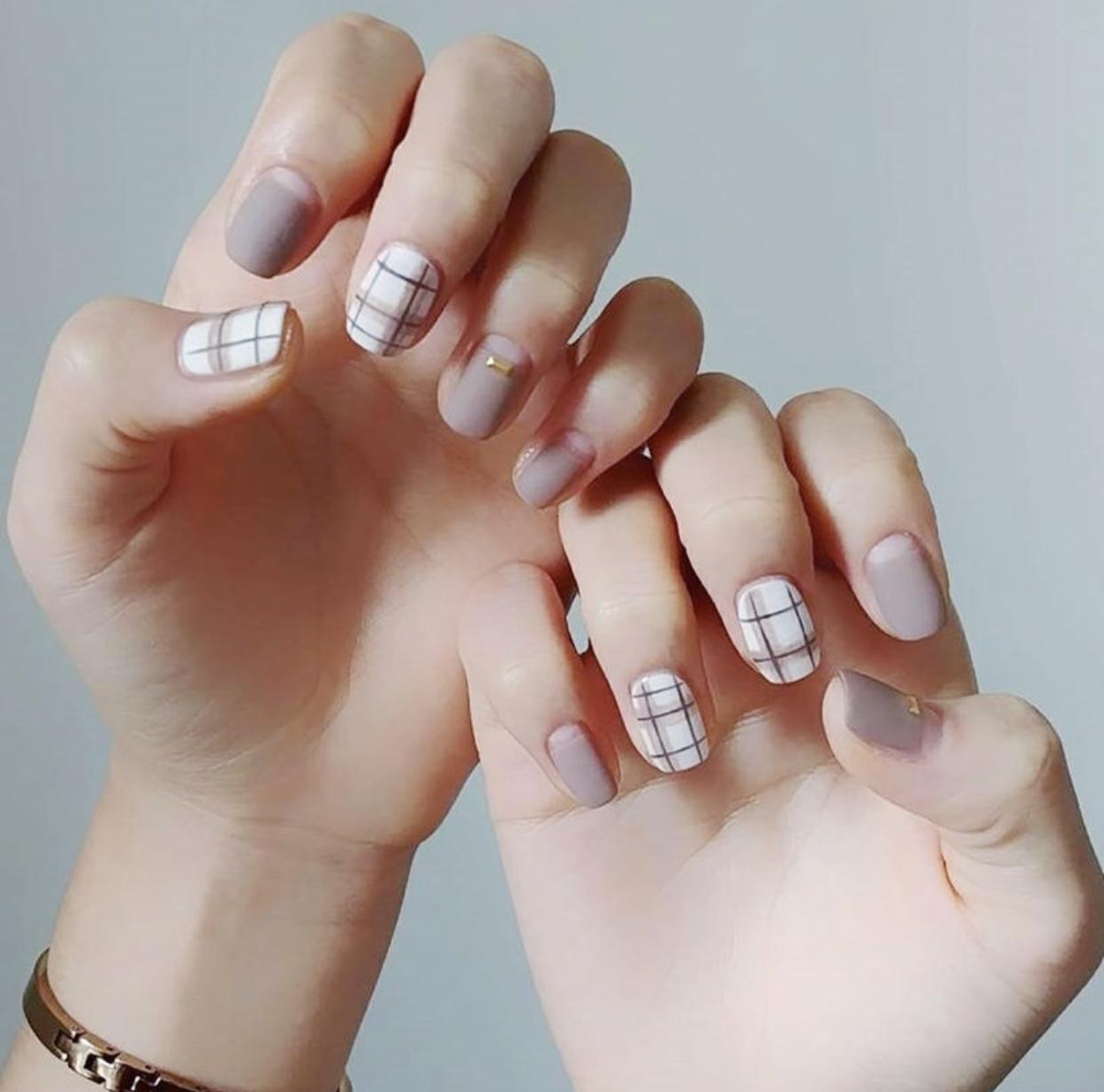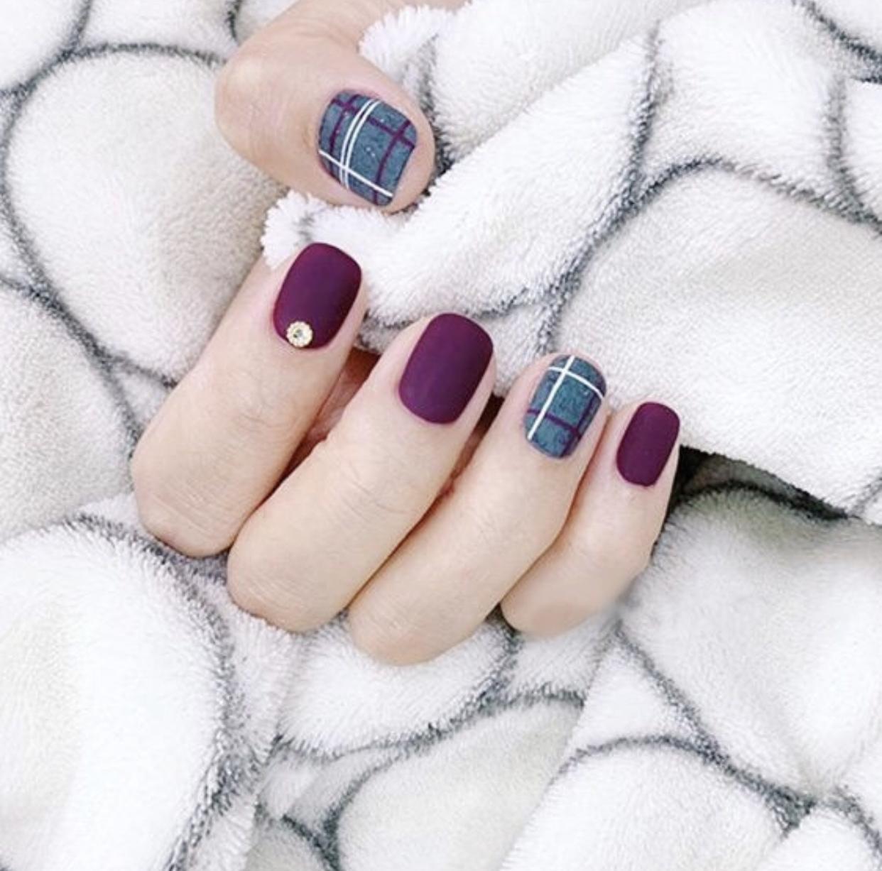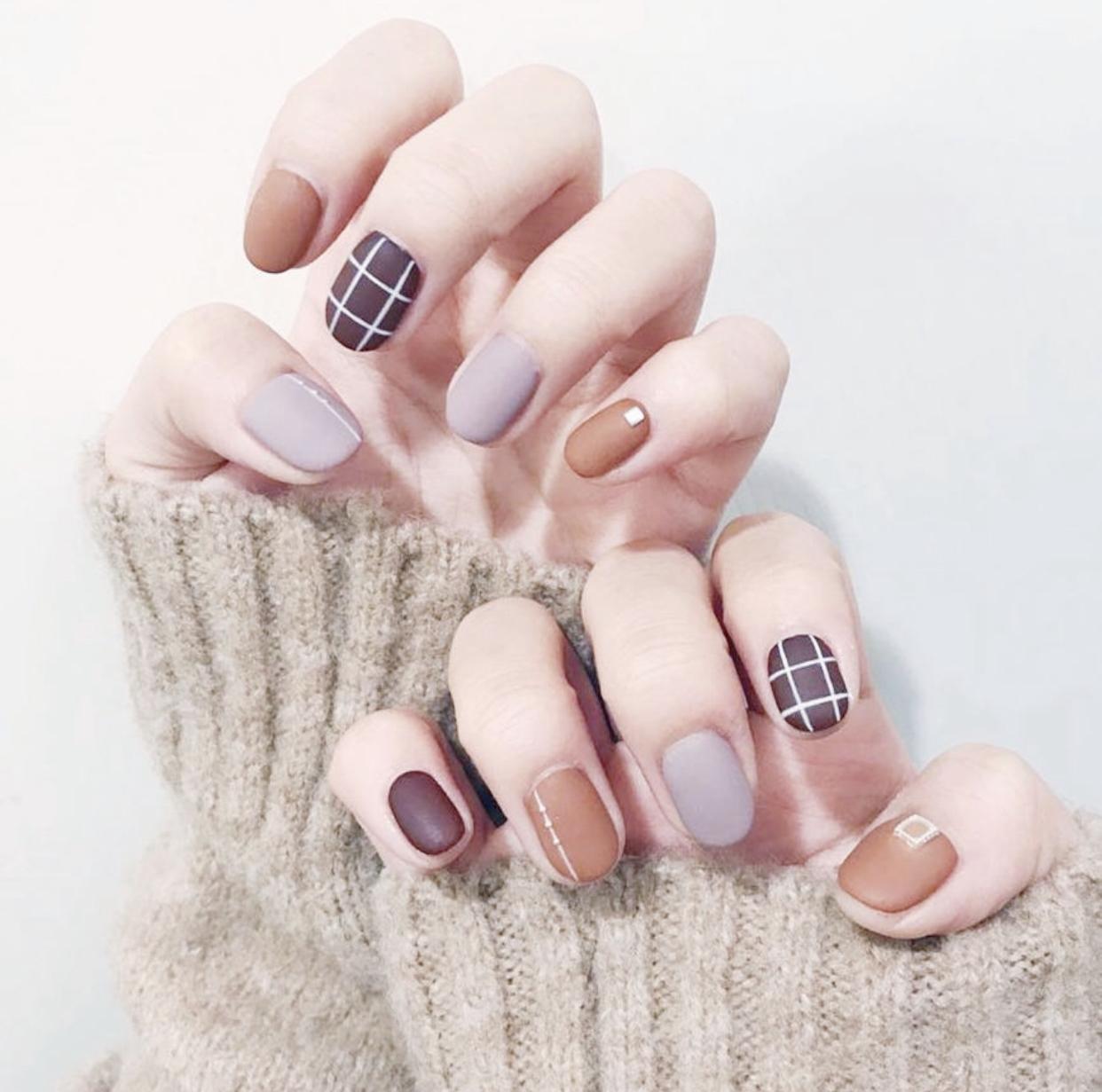 精致的格纹美甲,刷上磨砂封层会显得格外精致细腻,哑光的质感就像是开启了柔焦,让指尖的线条显得格外优雅,这样的格纹美甲有着布艺一般逼真的质感,非常适合秋冬季寒冷的天气,会有温暖的视觉效果。