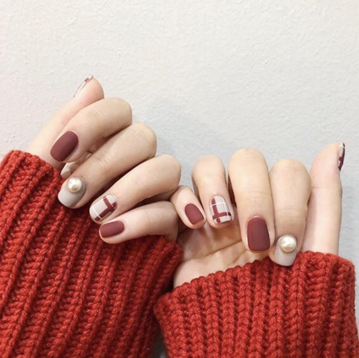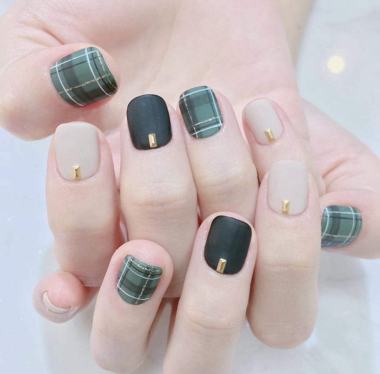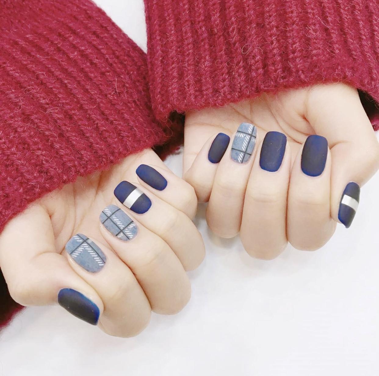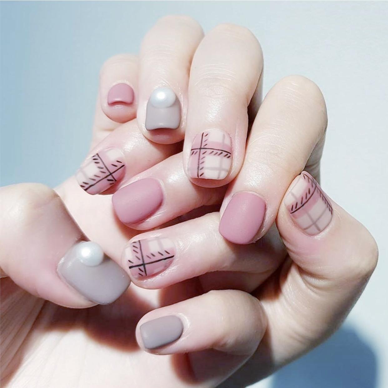 精致的格纹美甲,刷上磨砂封层会显得格外精致细腻,哑光的质感就像是开启了柔焦,让指尖的线条显得格外优雅,这样的格纹美甲有着布艺一般逼真的质感,非常适合秋冬季寒冷的天气,会有温暖的视觉效果。