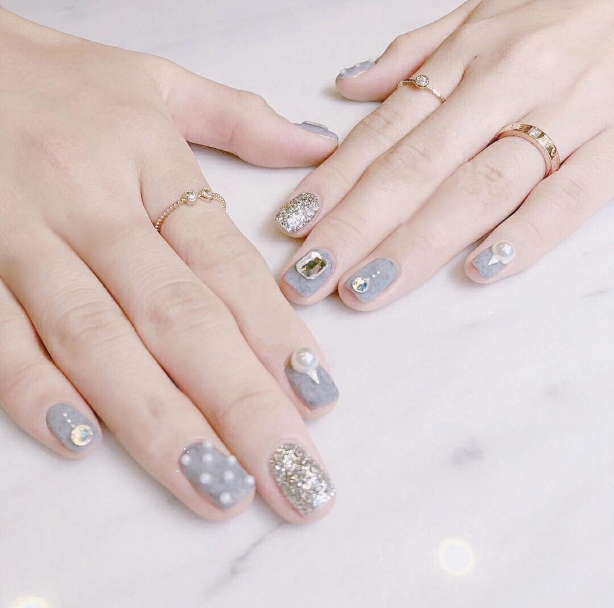 灰色的磨砂美甲,恰好展现出了灰色的优雅气质,没有了耀眼的光芒,反而显得更有高级感了,加上一些闪亮的饰品,会显得格外有气质哦!