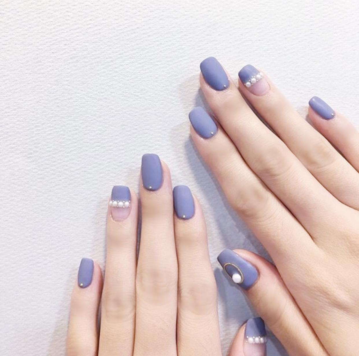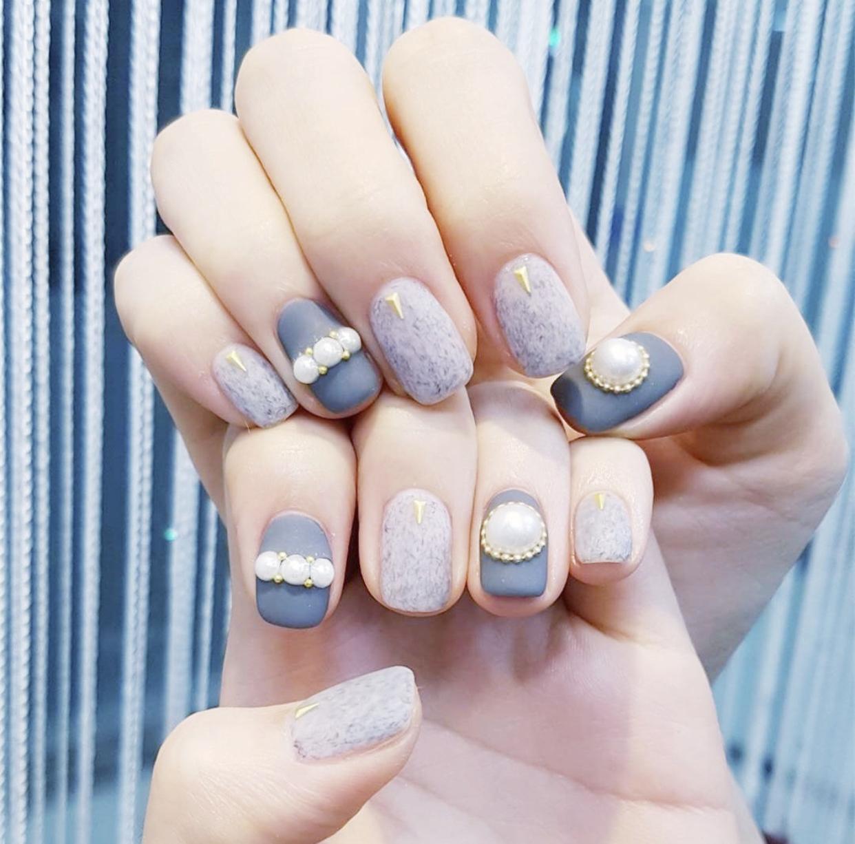 磨砂美甲相对而言比较低调,毕竟没有了闪亮的光泽,如果你既想拥有磨砂美甲的高级质感,又想让指尖有更多的亮点,不妨尝试在美甲上加上一些珍珠饰品,优雅亮白的珍珠饰品,不仅点亮了指尖,散发出的温婉大方的气质,也是非常迷人哦!