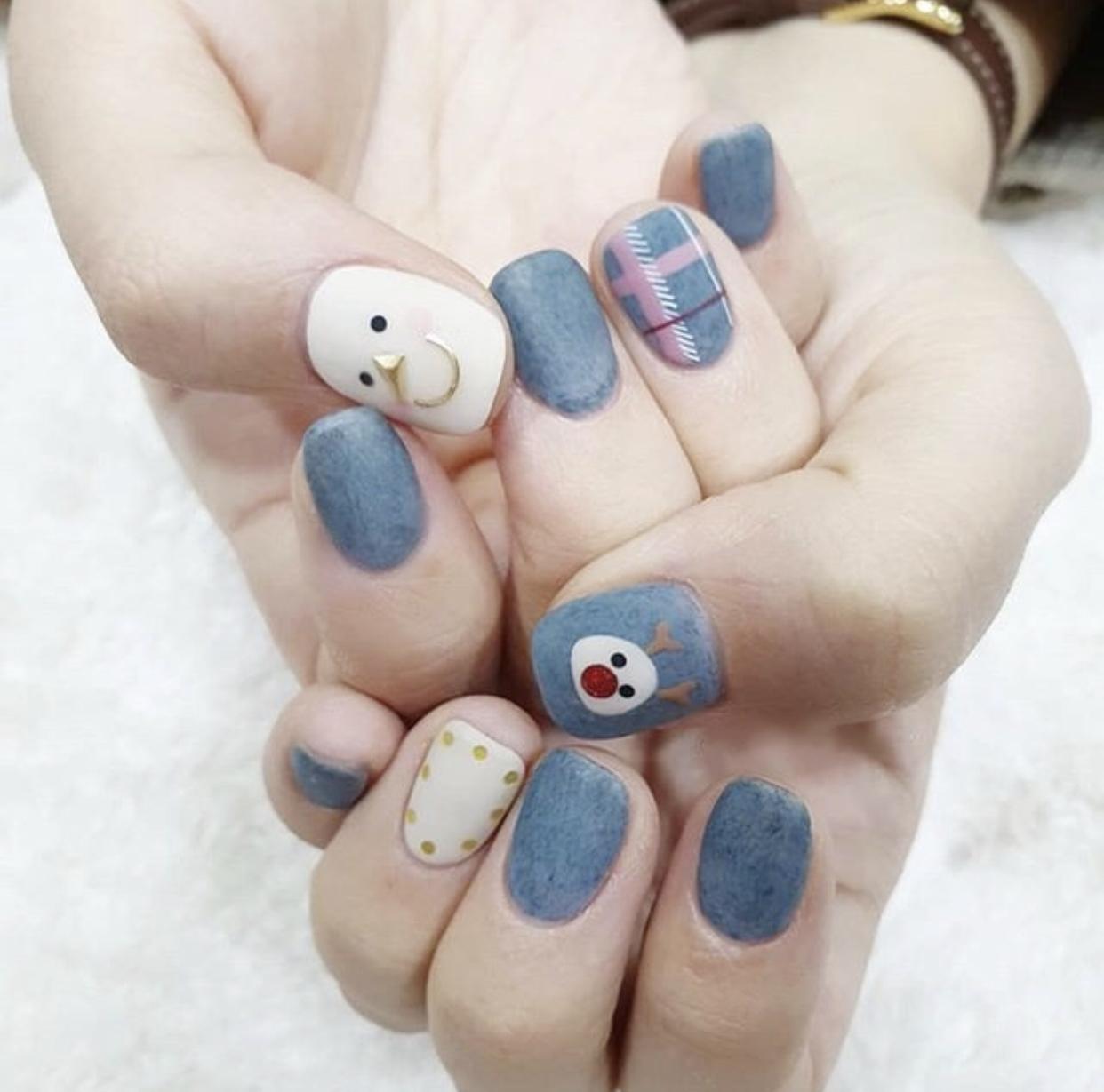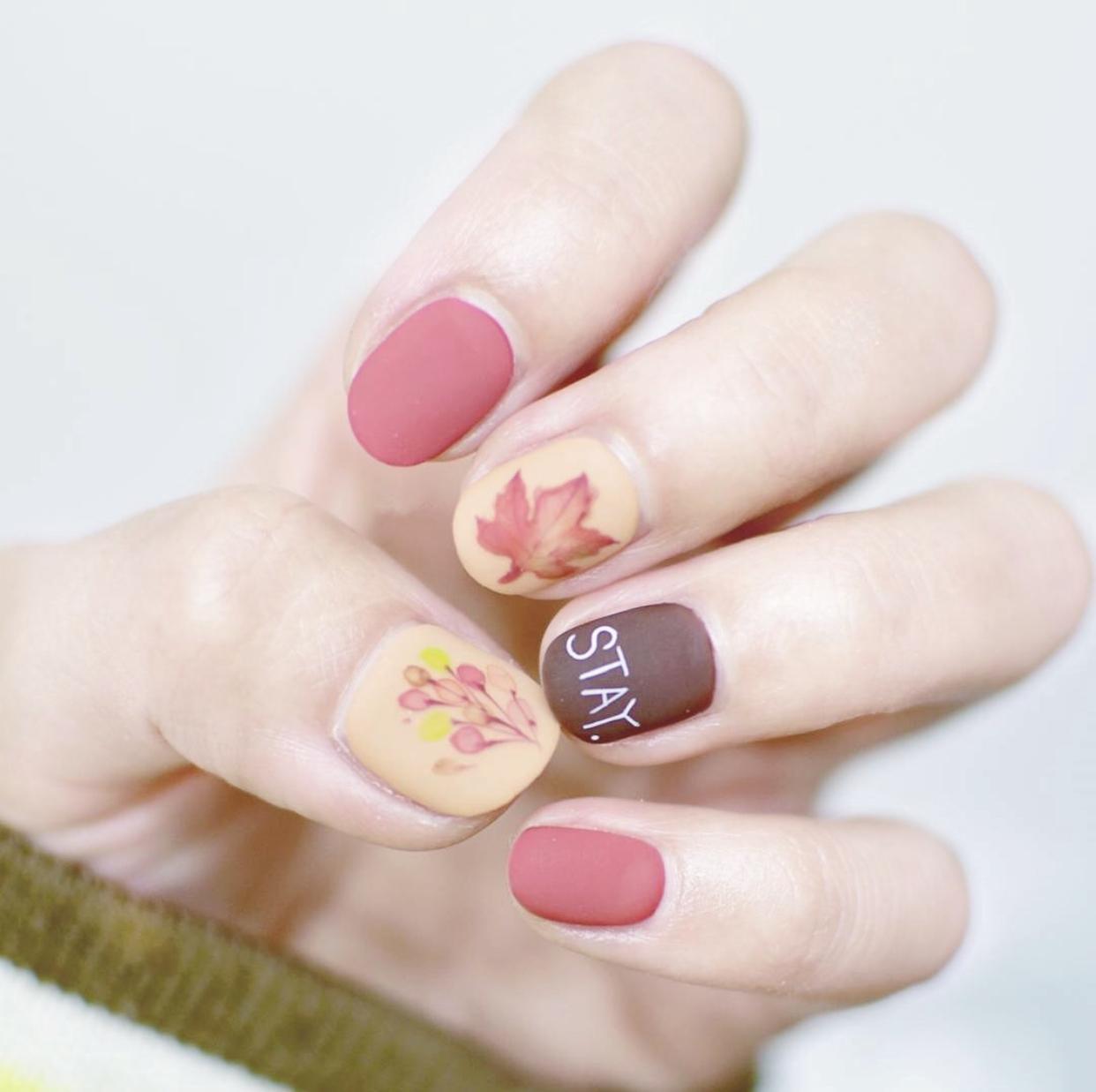 在指尖画上落叶的形状,再刷上磨砂封层,会有水彩画一样细腻唯美的质感,更增添了冬天的意境感,会让指尖更有气质哦~