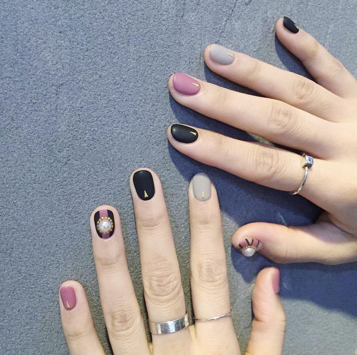 除了单纯的磨山美甲,还可以用普通的纯色美甲搭配磨砂美甲,哑光和光泽感的混搭,让指尖更有亮点,也是非常有趣的美甲。