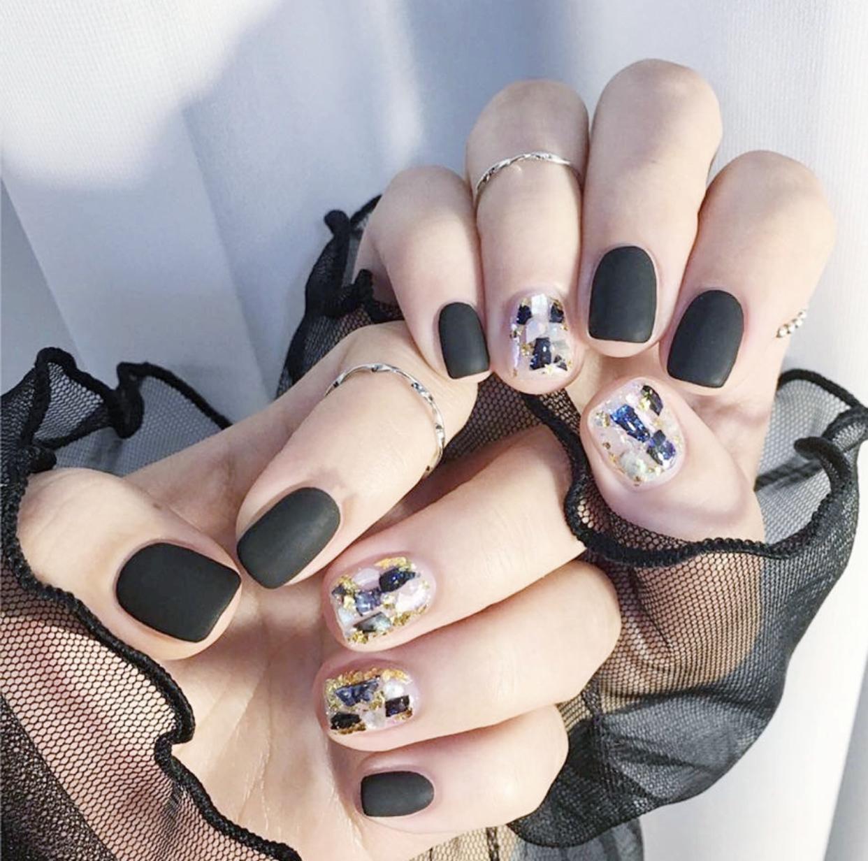 酷酷的黑色美甲,刷上磨砂封层,会呈现出优雅的高级感,让黑色的时髦气质更好的显现出来了,搭配上裸透质感的亮片甲,又多了一些甜美少女风,把黑色演绎的更有亲和力了。