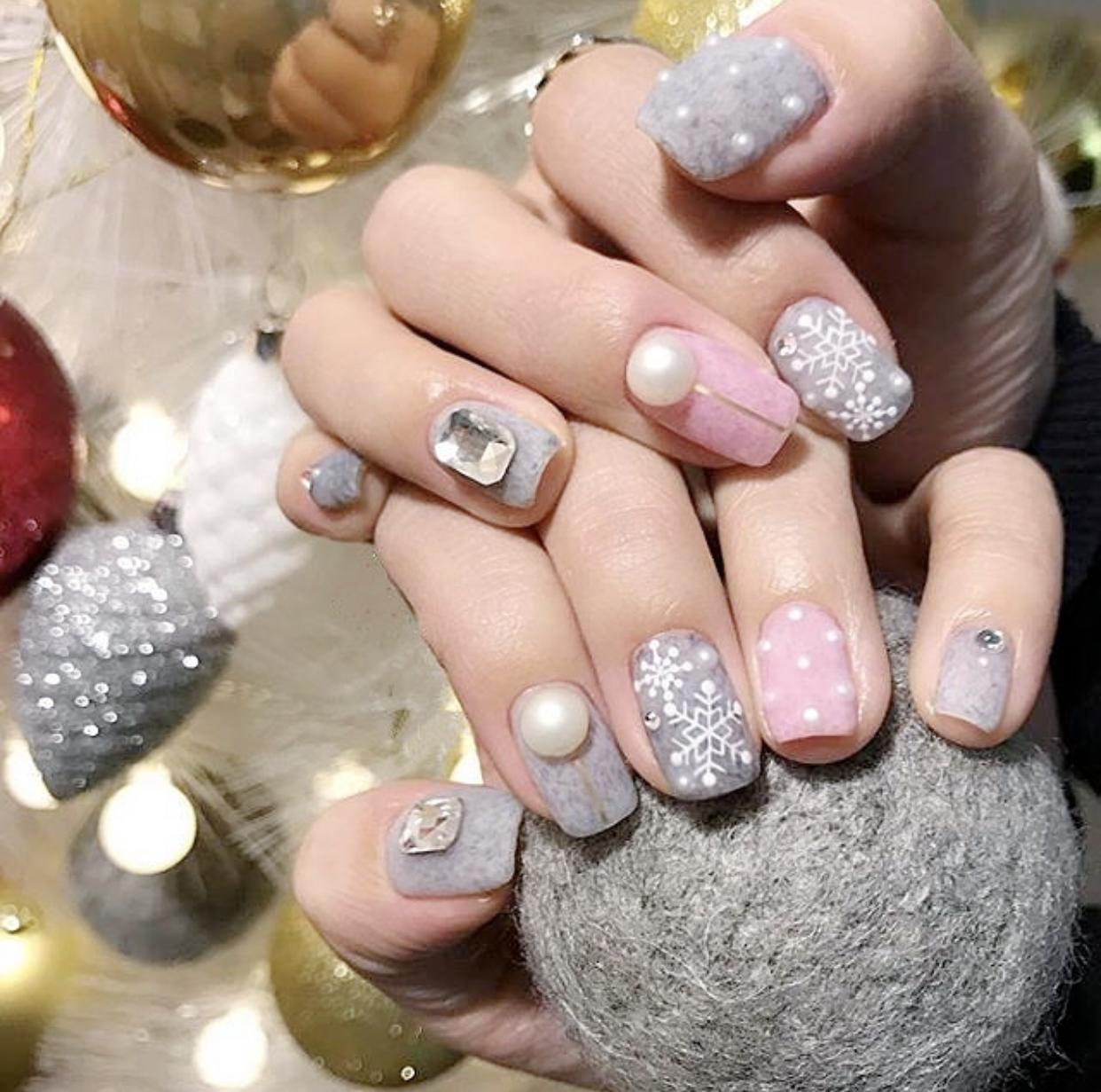 像这样精致的磨砂雪花美甲,在皮草胶打造的甲面上,会上精致的雪花图案,会显得格外浪漫哦~搭配上珍珠和钻石的装饰,即使是哑光的底色,也有了非常奢华的质感,而且会比光泽感的美甲更有时髦气质哦!