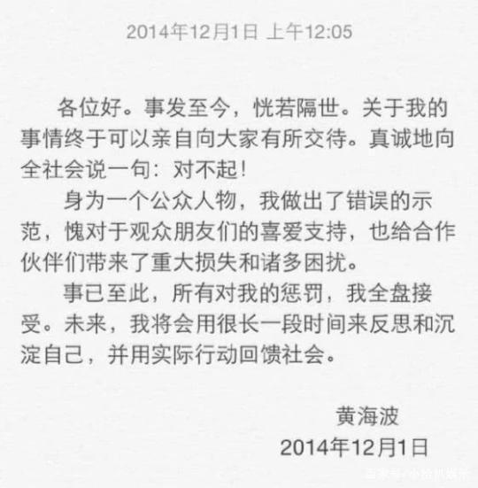 但是,他没有对这件事情做出任何的辩解,也没有向外界表现出一丝的委屈与不满,他只公开声明,向观众道歉,因为自己带来的不好影响而对曾经喜爱过自己的观众感到十分愧疚。