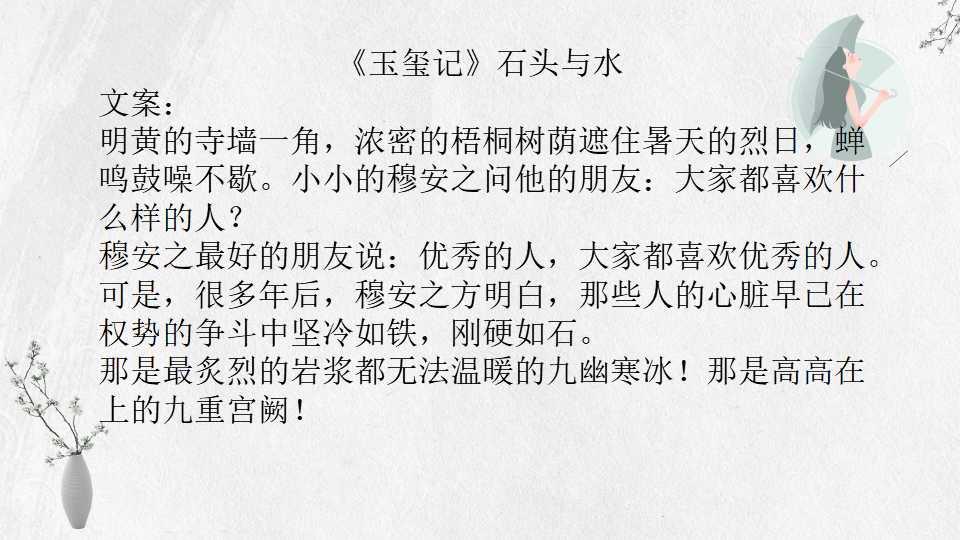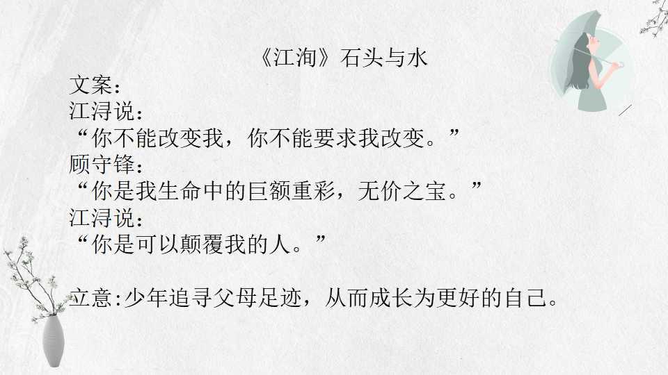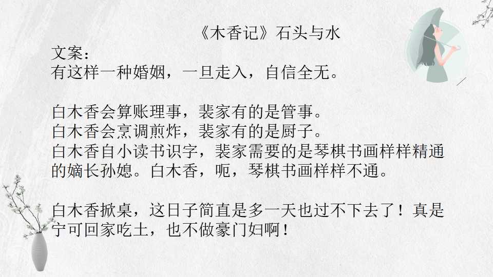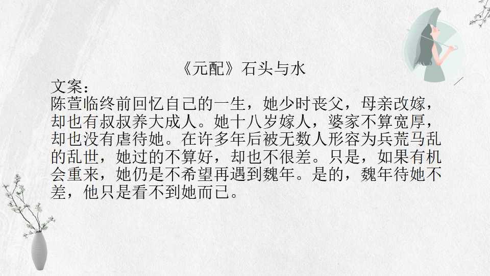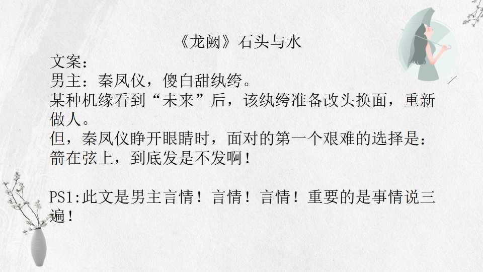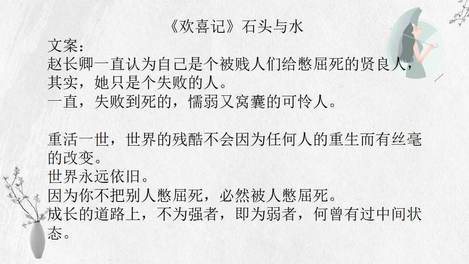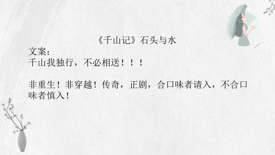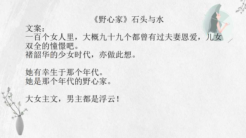 石头总体文风和内容更沉郁一些,字里行间有一种压抑感,反映了男权社会之下女性的生活。她的言情文虽然分类在言情,但更多体现独立女性的人格。所有的女主都非恋爱脑,当然石头的早期文也存在恶毒女配。石头的《千金记》《美人记》《千山记》强烈安利,这几篇文大概就如看文艺片,看完感想万千,沉静在剧情中,带来很多自己对当下生活的思考。