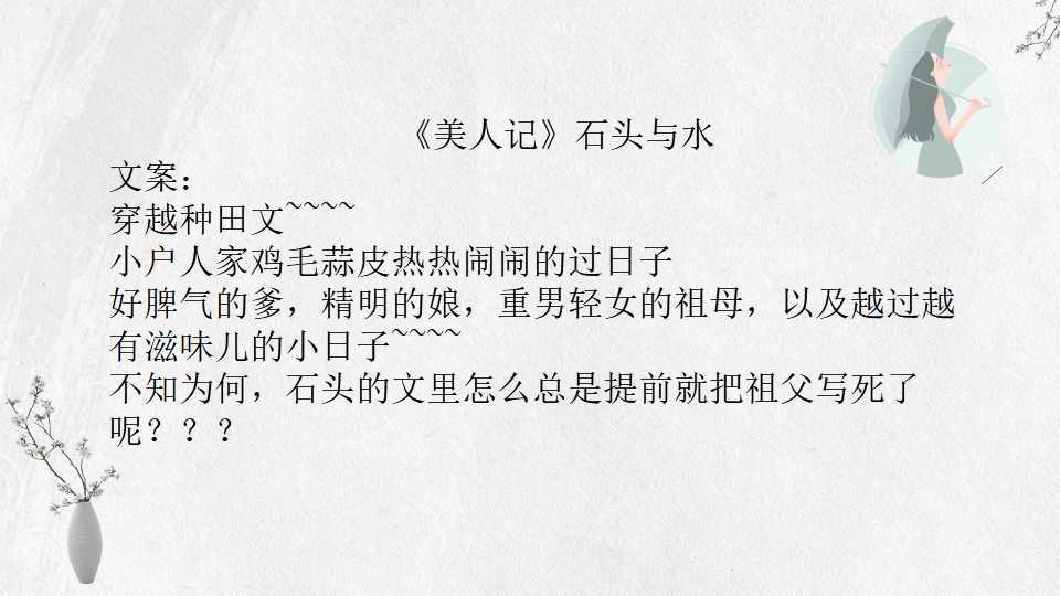 《美人记》这是石头所有文里最甜的一本,甜不在言情线,而是家庭氛围好,人物行事有度,心有底线和良知。女主穿越秀才家的女娃,一家热闹温馨和鸡飞狗跳的生活,女主智斗何老娘,把一个重男轻女的老太太,硬生生掰成叫她心肝宝贝的小老太,难得写成一位有自己生活智慧的老太,两个人互斗很搞笑。