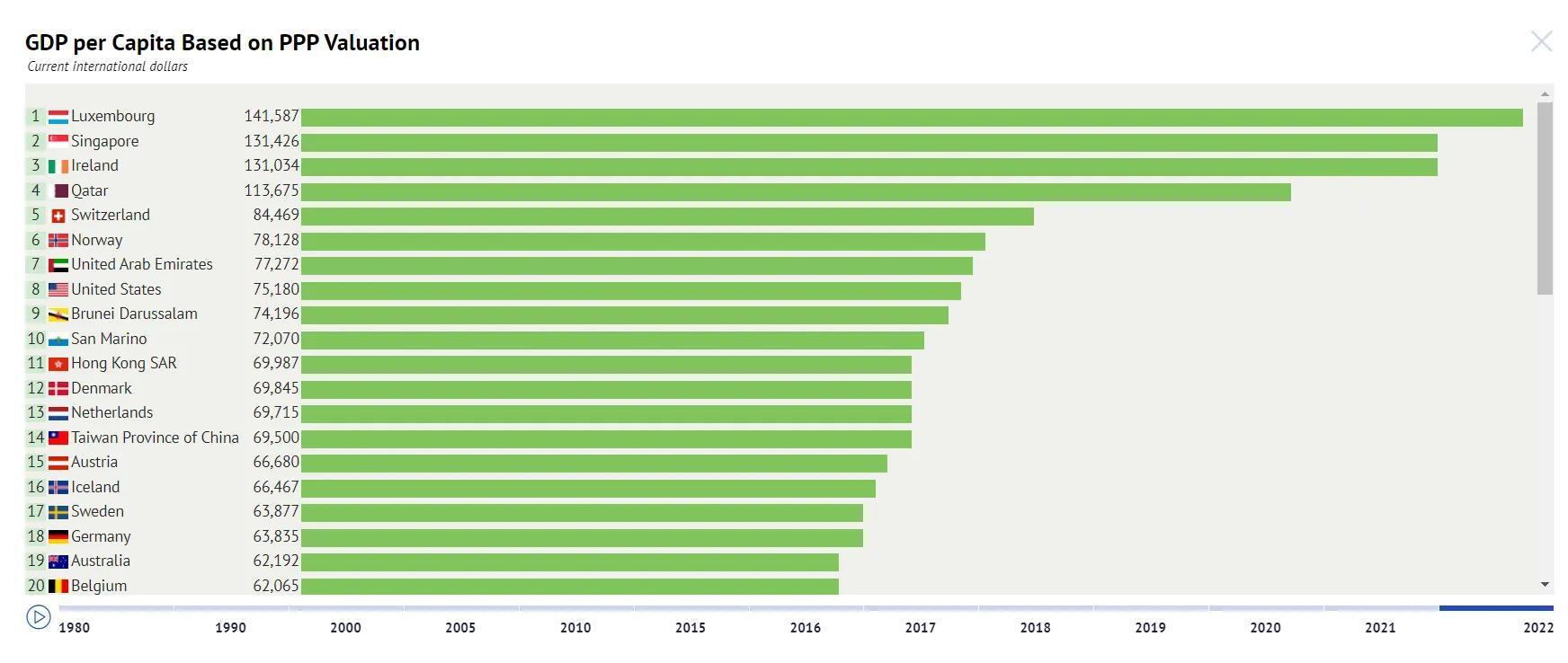 根据2022年世界货币基金组织的最新数据可以看到,中国人均GDP(PPP)约为国际美元21804美元,位于71位。全球最富裕的10个国家则分别是: