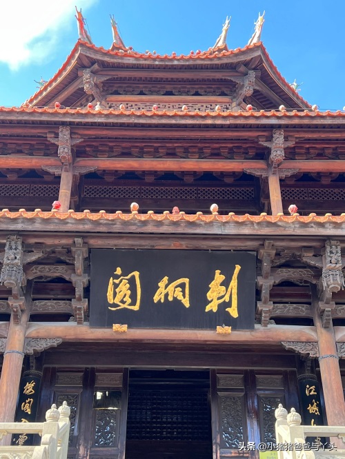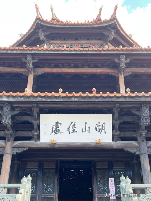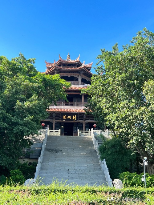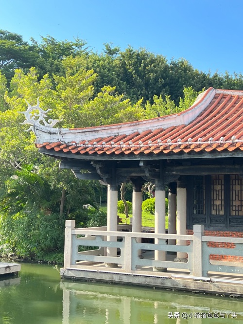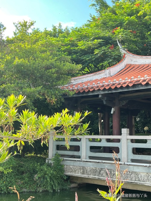 过了桥往右走大约两百米,穿过林荫小道,沿湖边走,可以看到凤凰花开,就到了典雅古朴造型、恢宏博大体量的“刺桐阁”。