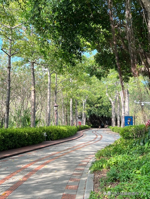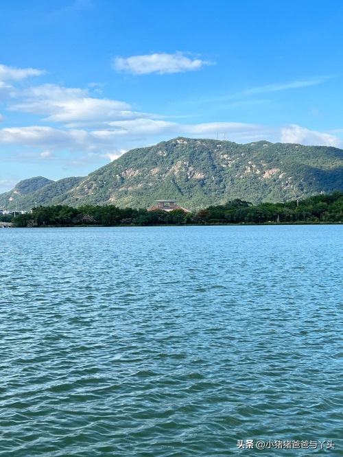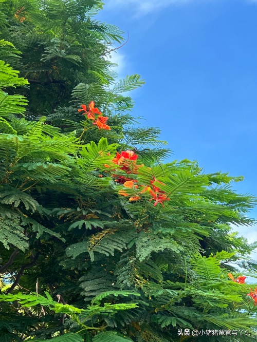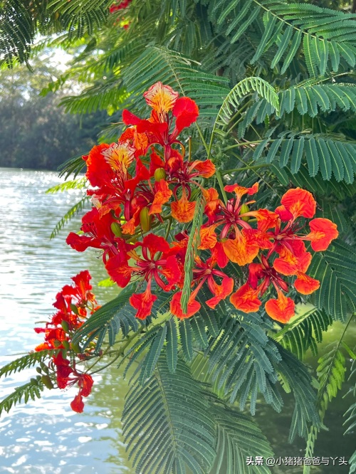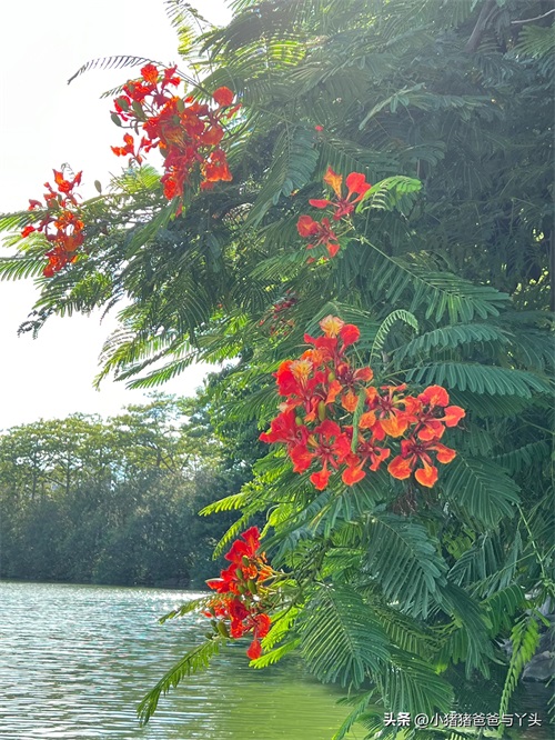 往回走,湖边有亭台楼榭,有凤凰木花开和果实,有大花紫薇,广阔的湖面显得很安静,美极了。