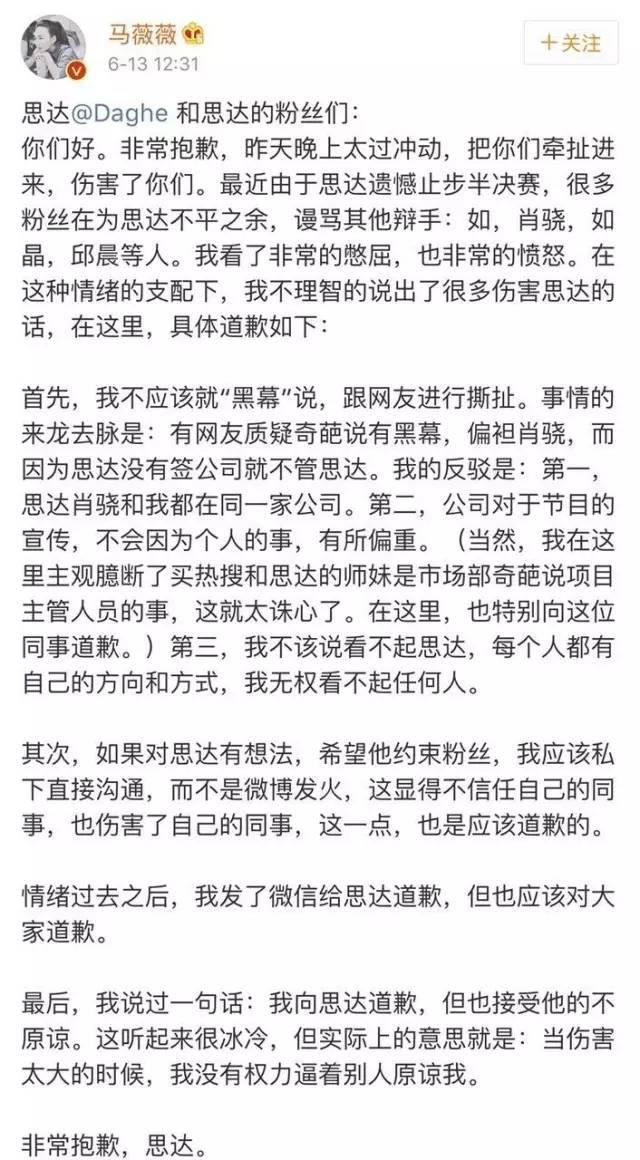 马薇薇在中午也再次发博道歉思达与思达粉丝。