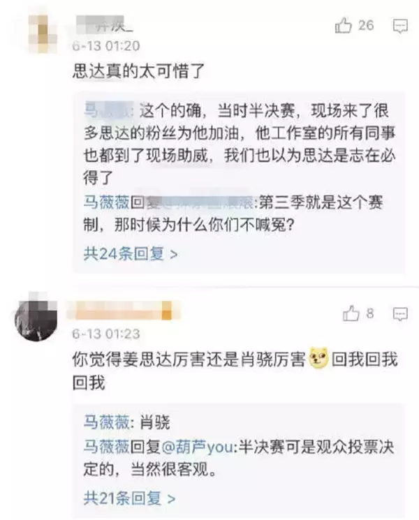 今日凌晨,马薇薇回复多位网友评论力挺肖骁,除反驳姜思达没签约被淘汰的言论,还指责姜思达违反辩论规则,求票丢人,更曝出不少比赛内幕。