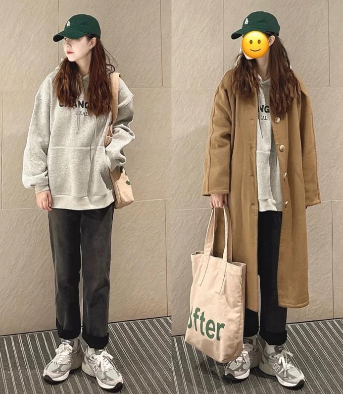 妥妥韩剧女主范的一套穿搭,绝了~驼色双面长款大衣,挺厚实的,大衣看起来也非常有质感。内搭选择一件浅色连帽卫衣,看起来就很显高级,也很不失休闲范!